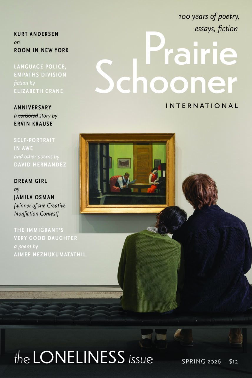 Spring 2026—the Loneliness Issue—features work by Kurt Andersen, Jeremy Tavares, Timothy Schaffert, Jamila Osman, Terese Svoboda, Elizabeth Crane, Cynthia Sylvester, Ciara Alfaro, Olufunke Ogundimu, Robert Brian Mulder, Matt Barrett, Milena Nigam, David Hernandez, Andrew Garvin, L. A. Johnson, Alex Tretbar, Alexandra Malouf, Judith Vollmer, Adam O. Davis, Daniel Hales, Winniebell Xinyu Zong, Brad Aaron Modlin, Yosra Bouslama, Rose McLarney, Daniel Barnum, Ross White, Christtie Jay, Scott Cairns, Warren Woessner, Tara Mesalik MacMahon, Jeannine Hall Gailey, Kelan Nee, Edwardson Ukata, Bryan Obinna Okwesili, Chisom Okafor, Saddiq Dzukogi, and Aimee Nezhukumatathil.